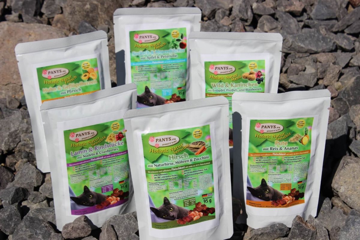 Alle PANYS Menüs im Pouchbeutel gibt es in 95 g und 295 g und sind als Alleinfuttermittel für ausgewachsene Katzen zugelassen. Mit wenigstens 60,0 % Fleischanteil und ohne Zuckerzusatz, sind es ernährungsphysiologisch ausgewogene Rezepturen.
